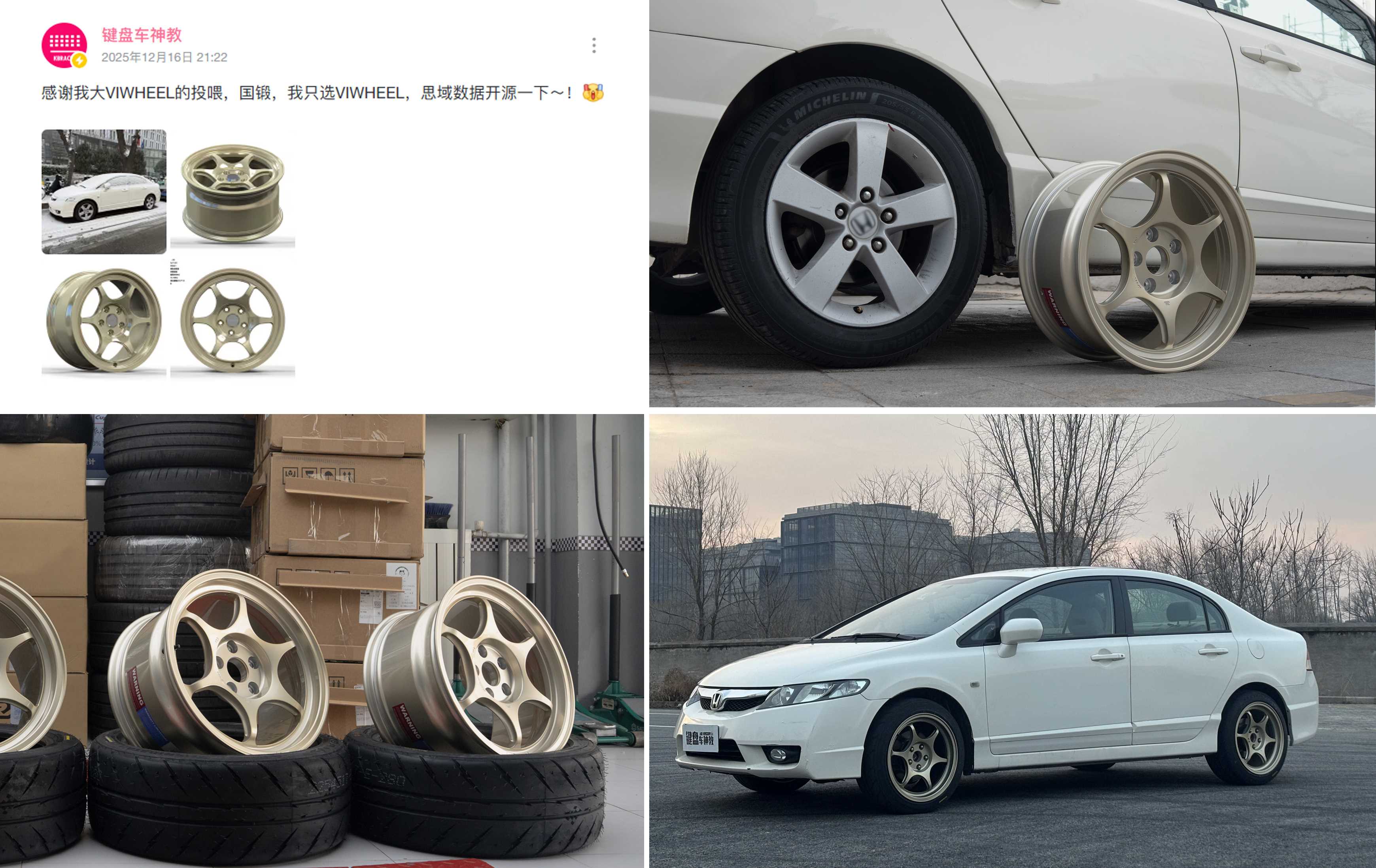 - 微博:键盘车神教教主 2025 年 12 月 27 日 万元思域改装官宣(Viwheel 轮毂规格、配色详解)